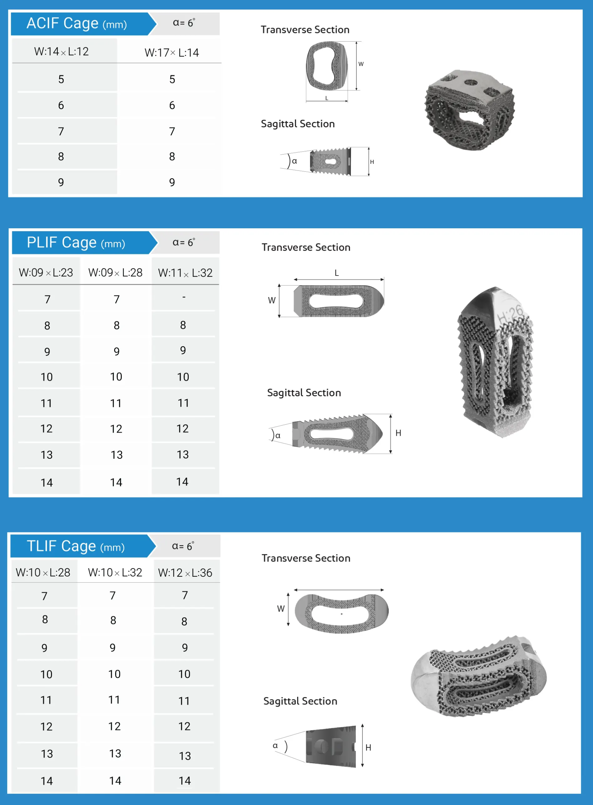 کیج‌های بنش مدیکال از آلیاژ تیتانیوم گرید ۲۳ پزشکی، ماده‌ای کاملا زیست سازگار و بسیار مستحکم تولید می‌شوند.. این کیج‌ها برای بیماران مبتلا به آسیب‌های دژنراتیو ستون فقرات، تحلیل و بیرون‌زدگی دیسک و تمامی بیماران نیازمند به فیوژن مهره‌های ناحیه گردنی بین مهره‌های C2-T1  و ناحیه کمری بین مهره‌ها‌ی S2-L1‌ قابل استفاده هستند.